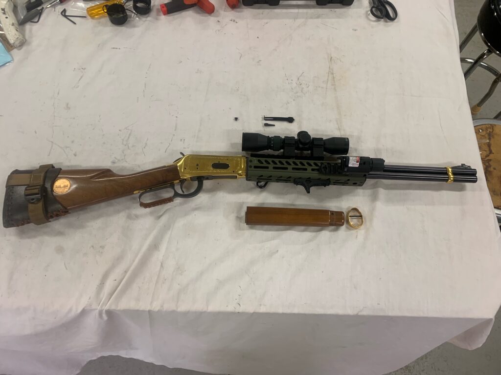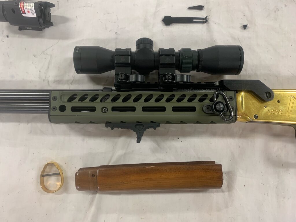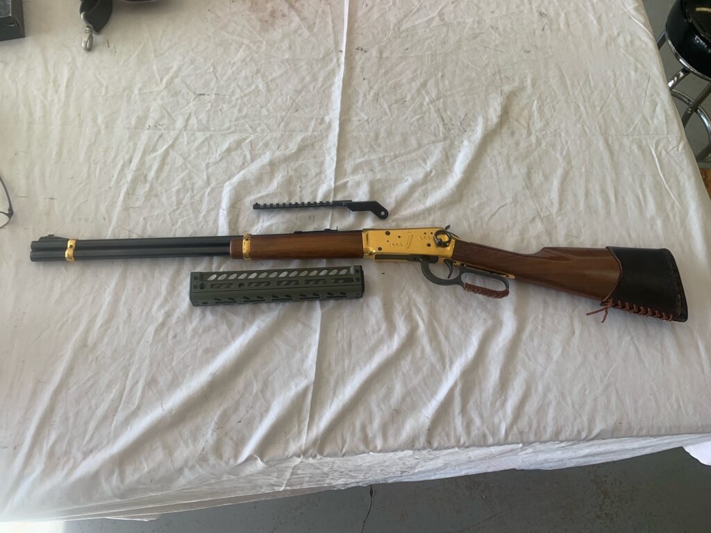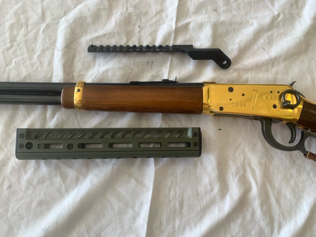 I found Dr. Pearson’s tactical rail mounts specifically made for the Winchester ’94. Although created for the carbine version and a non octagon barrel I ordered one anyway, since they were affordable enough to experiment with. With a little tweaking and smith work of my own I was able to fit the rail perfectly to my ’66 rifle.